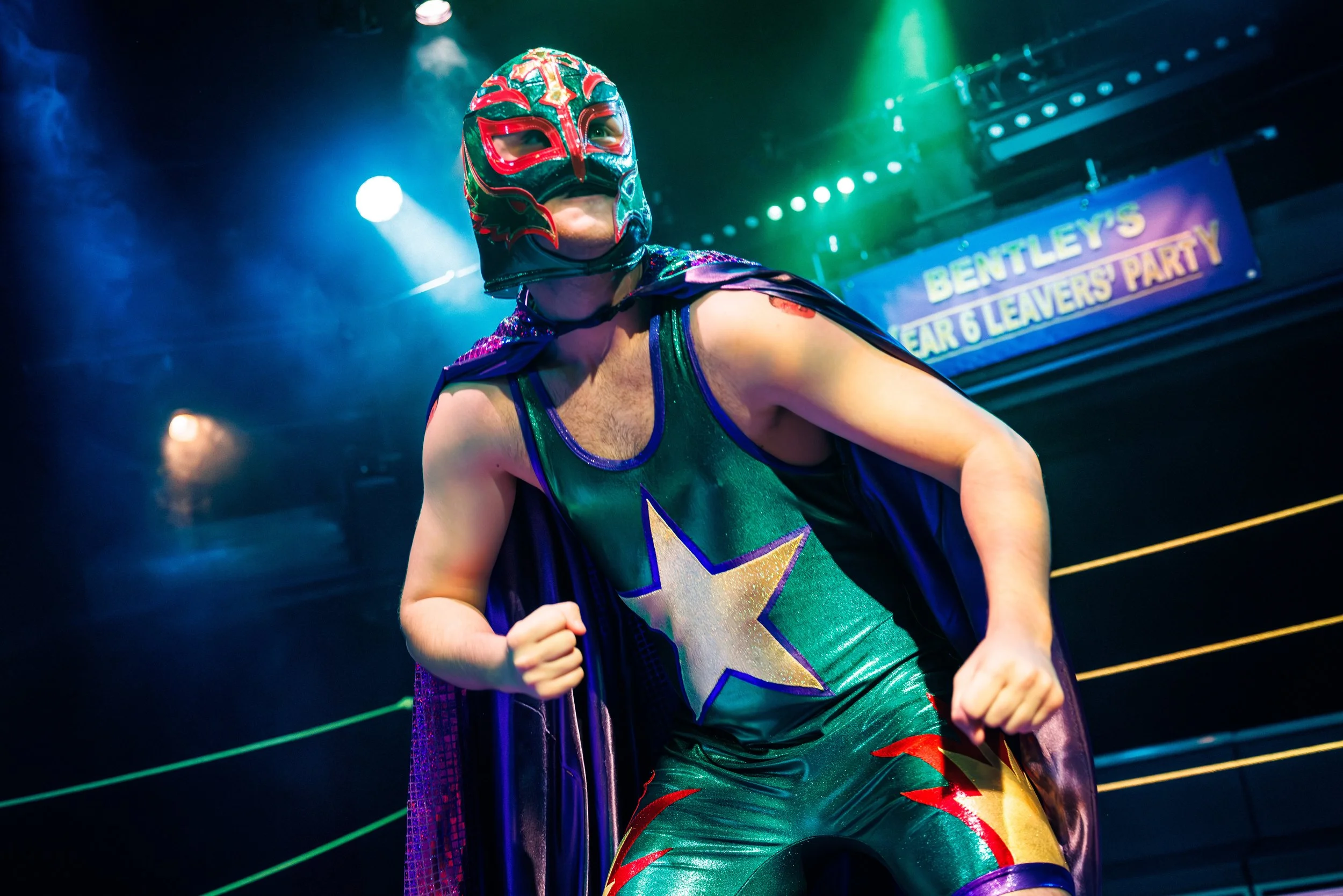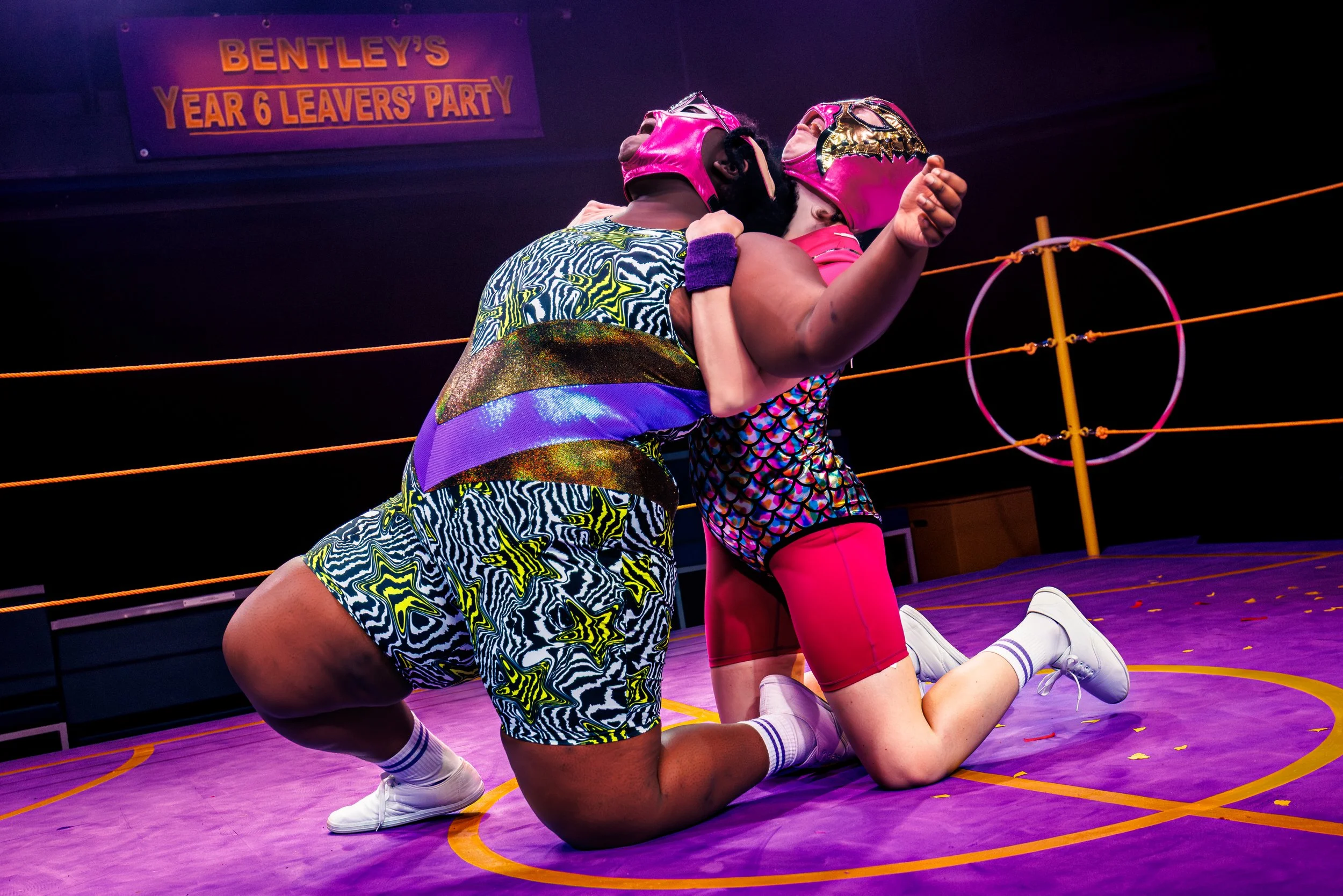“Katie Lias’ in-the-round set and vibrant costume design includes a glorious replica of an actual wrestling ring for the finale, as well as a plethora of ridiculous, appropriately garish fight costumes.”