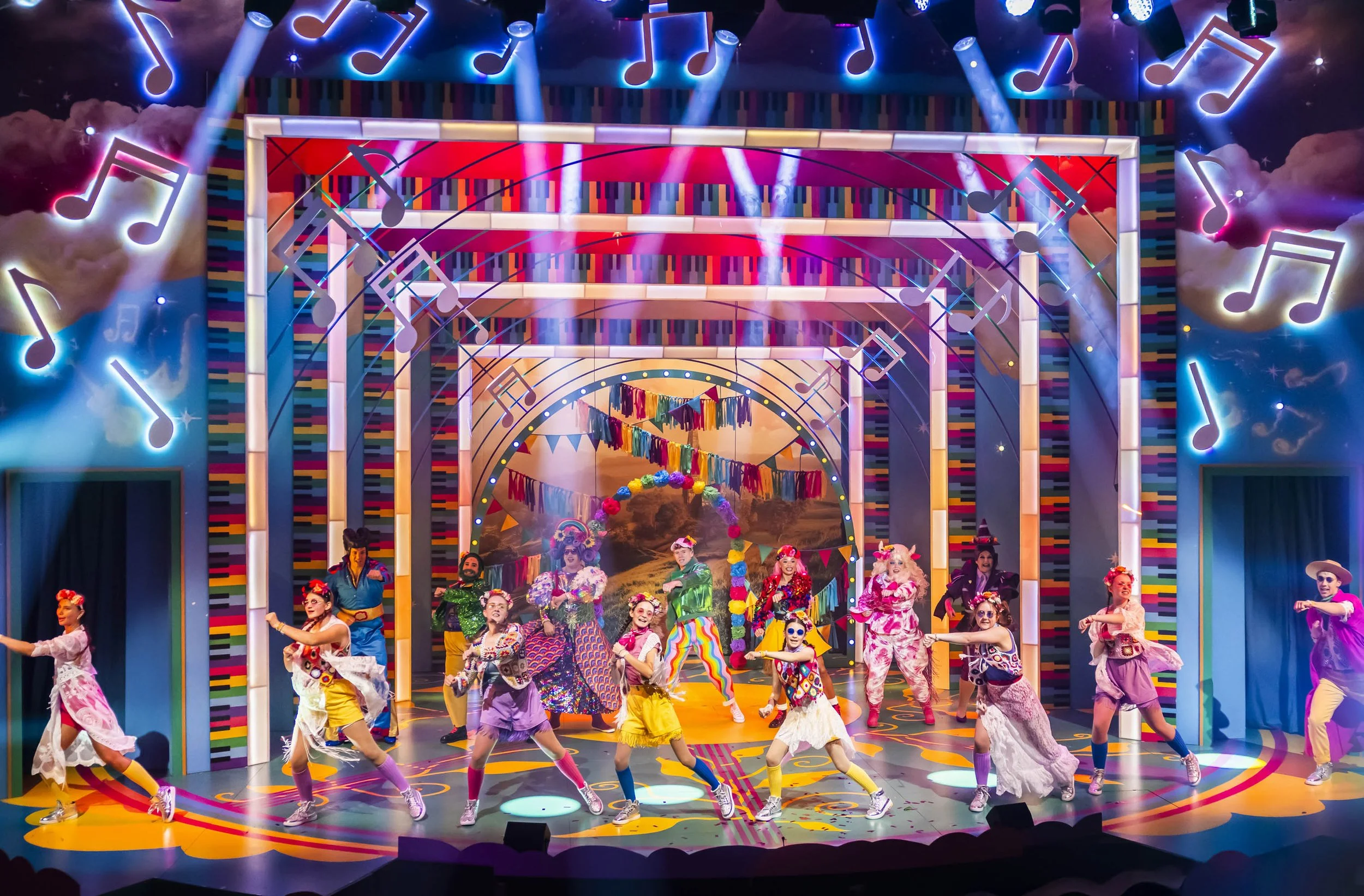 “Designer Katie Lias weaves musical motifs into the set and costumes, with musical notes in relief decorating the proscenium arch and head-dresses made from old vinyl records.”