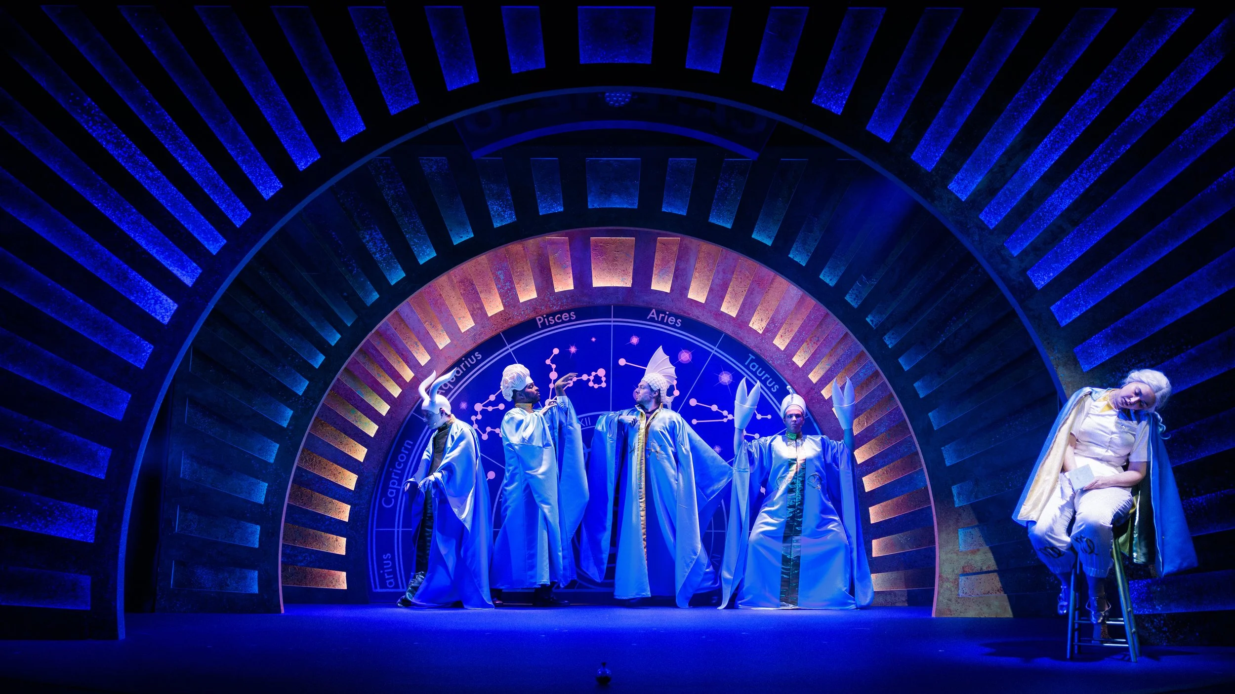 “Katie Lias’ costumes also bring a lot of colour to the stage, notably with the Zodiac Council’s distinctive blue and white robes and Virgo’s light-up cloak.”